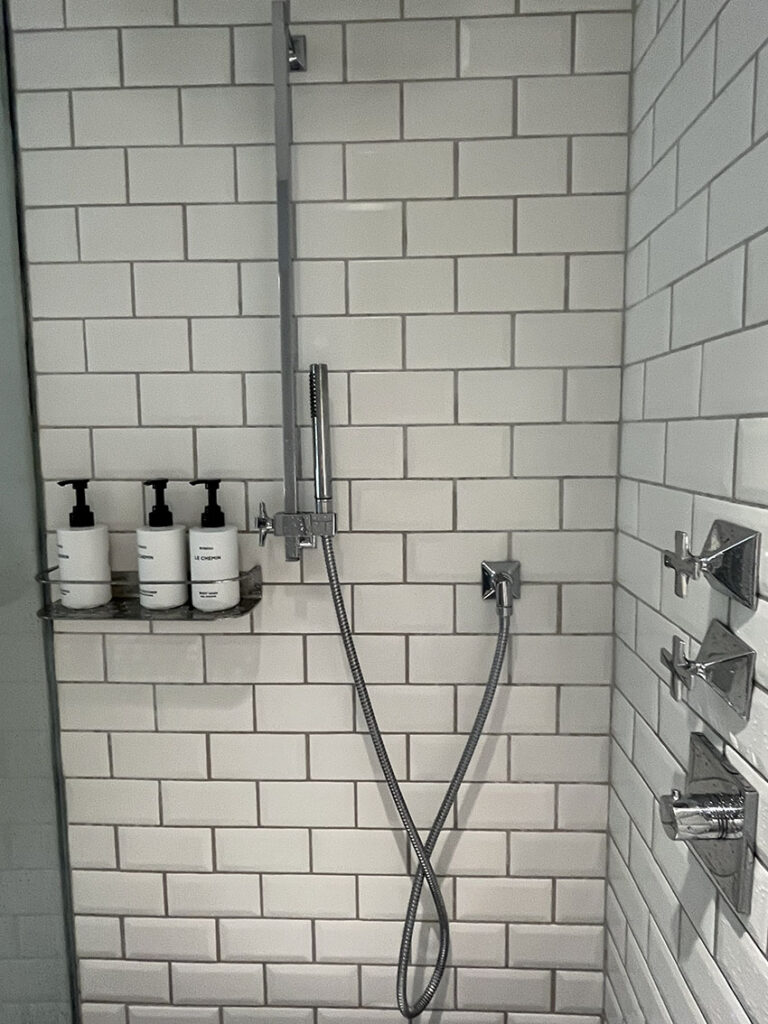 また、シャワーとバスタブ給湯の水栓が長手にあって、サーモスタットダイヤルとシャワー・バスタブの給湯用ハンドルは別です。とてもわかりやすく、シャワーからも湯舟からも操作しやすい絶妙な位置です。シャワーヘッドの位置を移動させるタワー(ポール)も海外としてはかなり低めから固定できてシャワーヘッド、ホースも軽く扱いやすいものでした。
