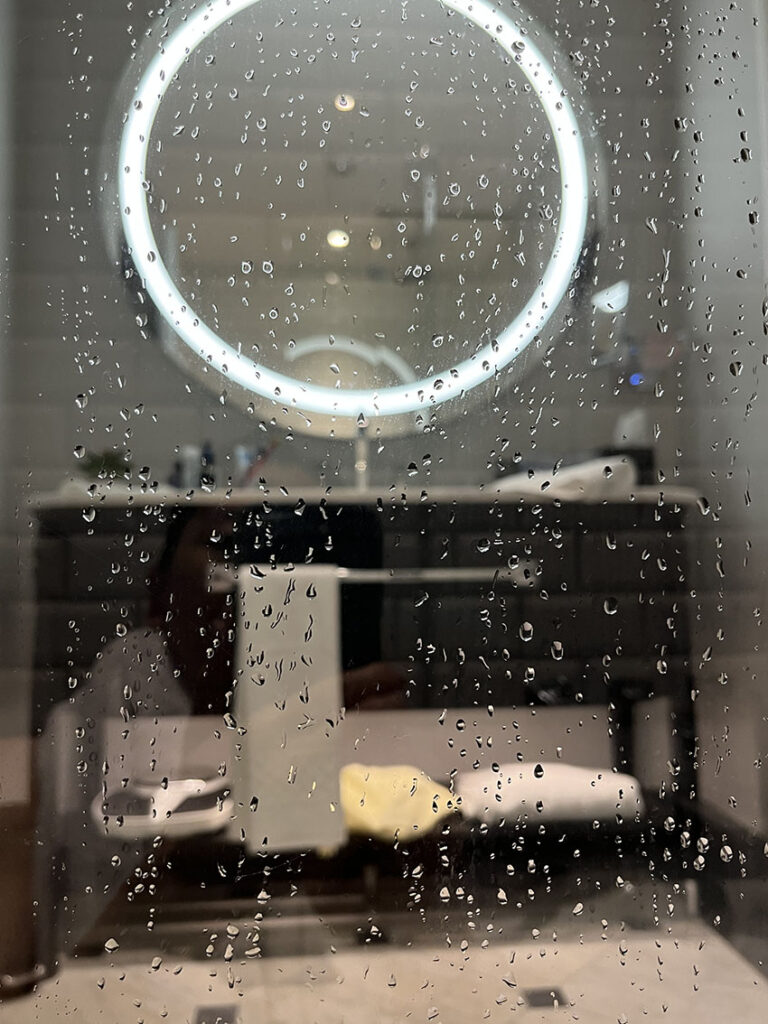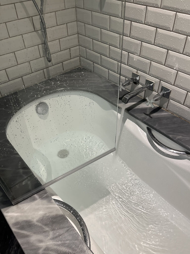 浴槽のガラスの仕切りは、途中から丁番で開く扉になっていますが、開けずとも手摺使って出入りするのに不自由ない寸法です。この扉浴槽外側のみ開くホテルが多いですが、内側にも開くことができるので出入りやバスタブの掃除がよりしやすく、入浴後の水滴は内側に開けば外へこぼれません。あわせてこの仕切りは、シャワーを使ってみると水がはねて洗面側の床を濡らすこともない丁度よい長さです。